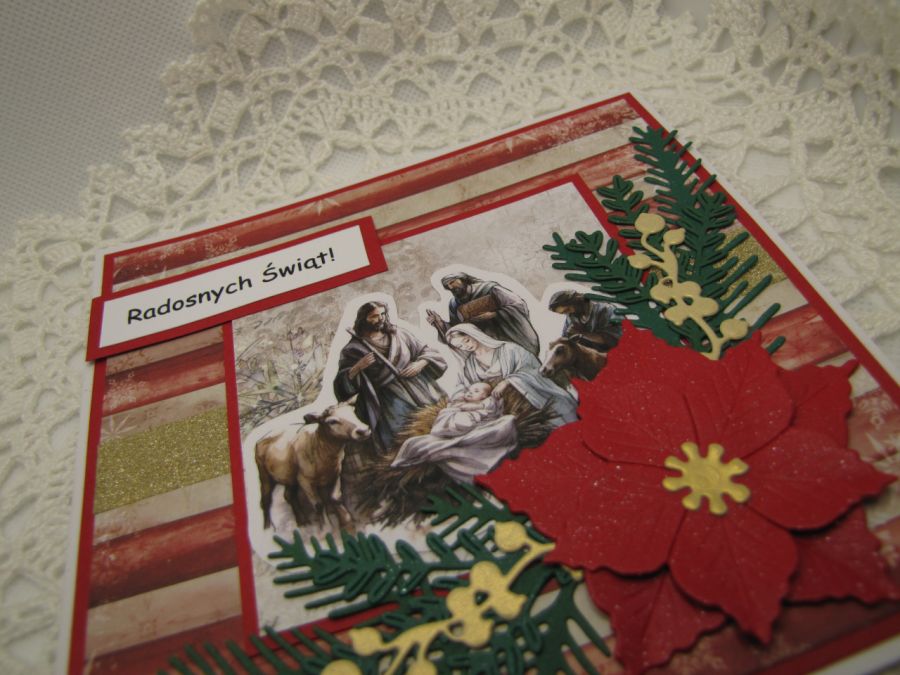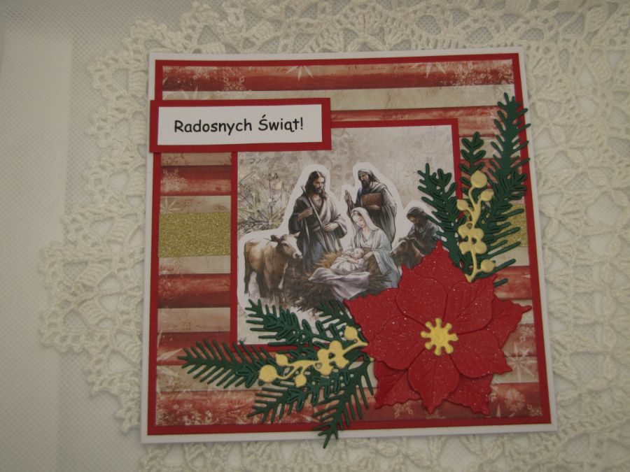 Kartka bożonarodzeniowa w świątecznych kolorach z błyskiem złota. W centrum święta Rodzina - kartka w klimacie religijnym. Piękny pamiątka dla bliskich osób. Całość wykonana starannie z najwyższej jakości materiałów na bazie białej 13,5x13,5cm. Wewnątrz pusta - miejsce na życzenia, jednak na prośbę kupującego mogę takie życzenia wydrukować i wkleić. Do kartki dołączona pasująca koperta.