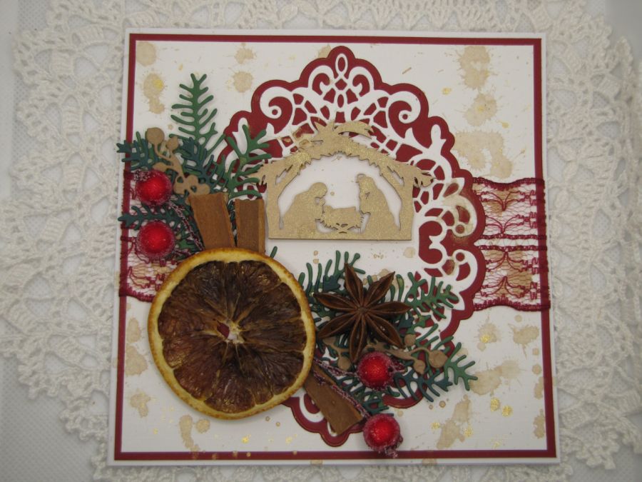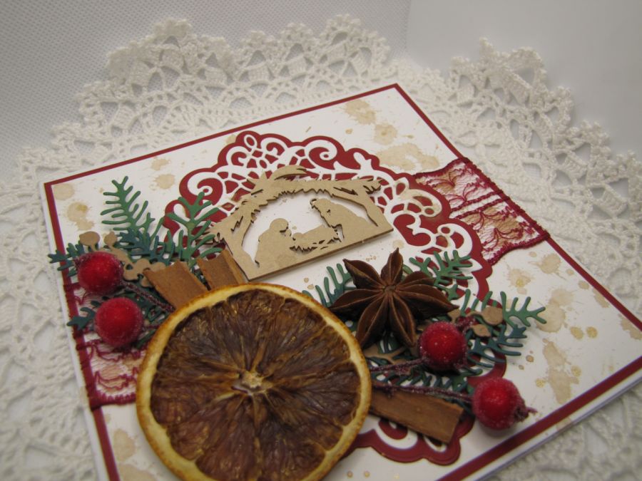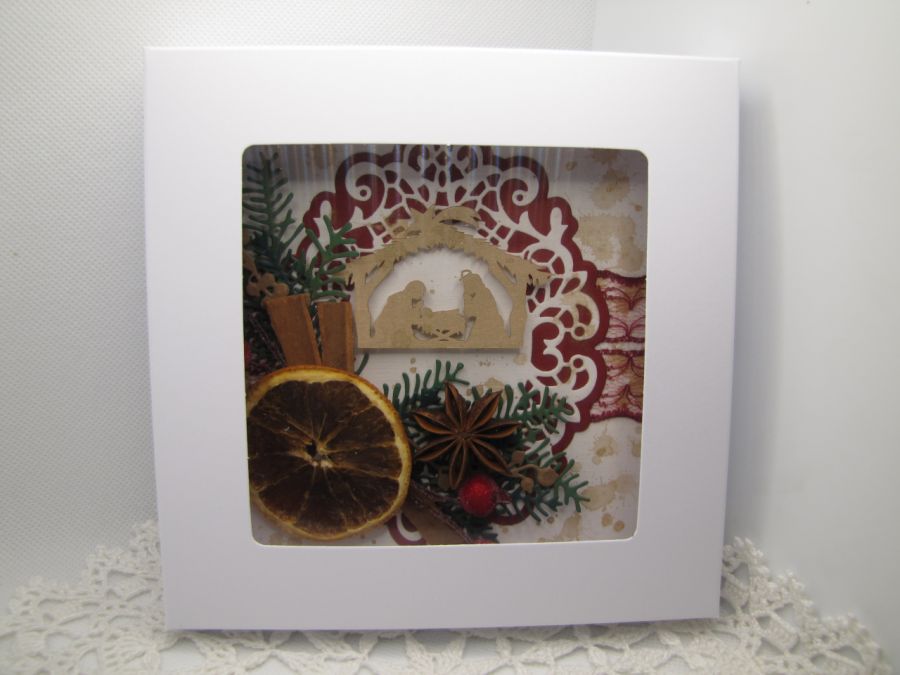 Niezwykła kartka świąteczna, której ozdobą oprócz tekturkowej Szopki jest suszony plaster pomarańczy, kawałki kory cynamonowej i gwiazdka anyżu, które nadają kartce lekkiego korzennego zapachu. Kartka wewnątrz jest pusta, jest miejsce na życzenia, jednak na prośbę kupującego mogę takie życzenia wydrukować i wkleić. Do kartki dołączone jest pudełko z ładnie eksponującym okienkiem. Wymiary pudełka 15x15x2,5cm.