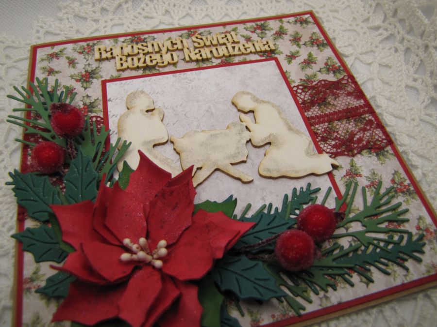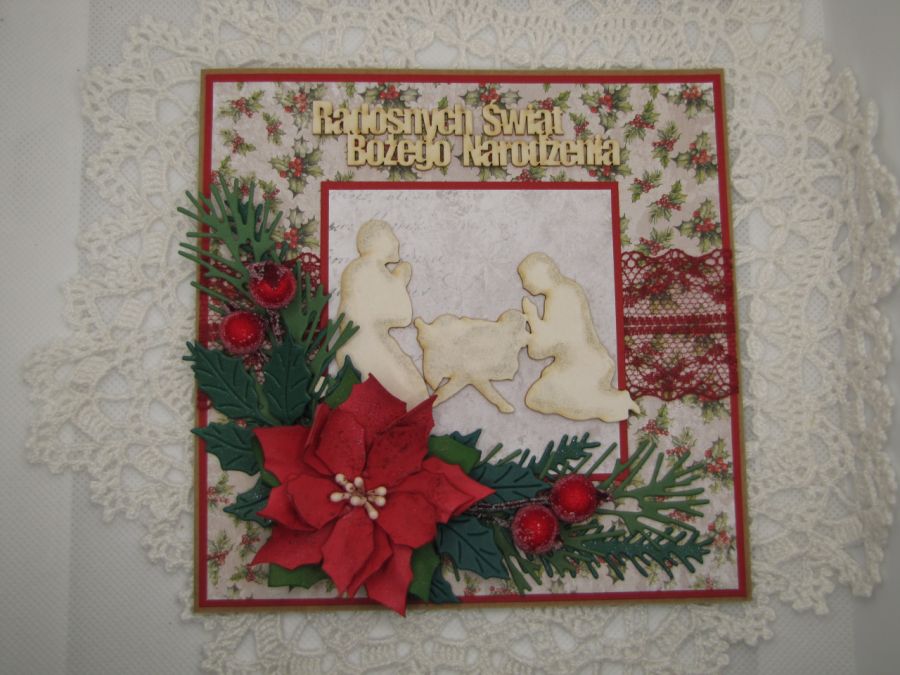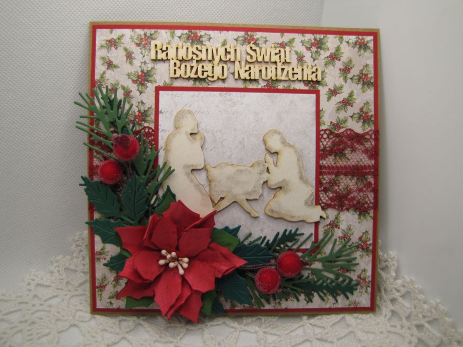 Świąteczna kartka z tekturką świętej Rodziny w centrum, utrzymana w zielono - czerwonej tonacji. Ozdobiona dużą czerwoną Poinsencją. Wykonana na ekokraftowej bazie. Kartka wewnątrz jest pusta, jest miejsce na życzenia, jednak na prośbę kupującego mogę takie życzenia wydrukować i wkleić. Do kartki dołączone jest pudełko z ładnie eksponującym okienkiem. Wymiary pudełka 15x15x2,5cm.