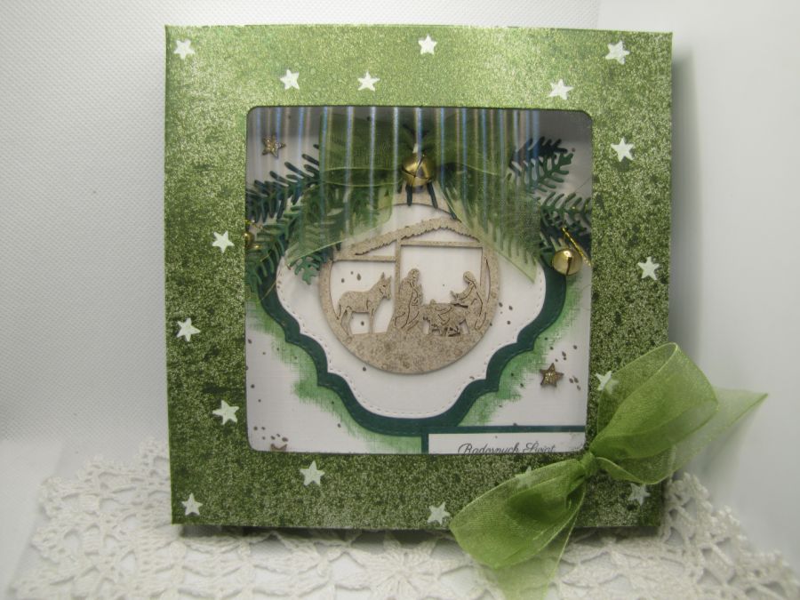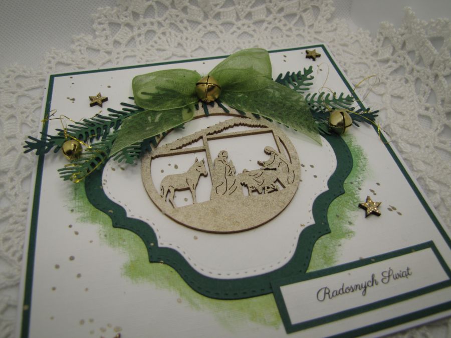 Kartka świąteczna w zielono - złotej tonacji. W centrum tekturka bombka z Szopką, ozdobiona szyfonową kokardką i złotymi dzwoneczkami. Wykonana na białej bazie. Kartka wewnątrz jest pusta, jest miejsce na życzenia, jednak na prośbę kupującego mogę takie życzenia wydrukować i wkleić. Do kartki dołączone jest ozdobione pudełko z ładnie eksponującym okienkiem. Wymiary pudełka 15x15x2,5cm.