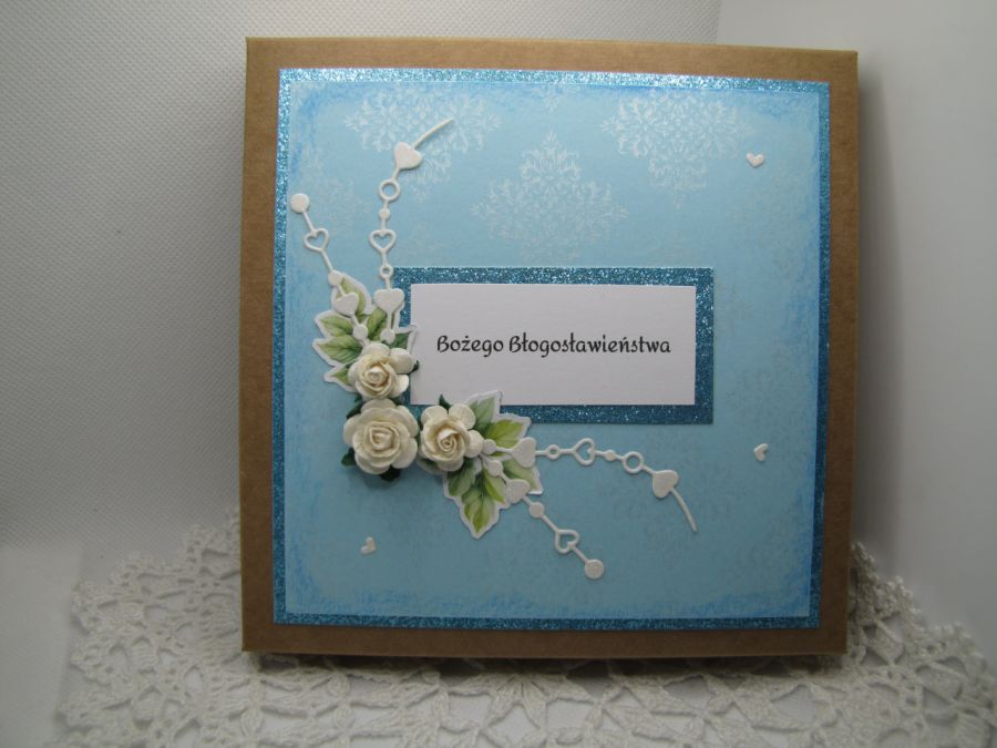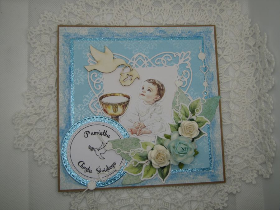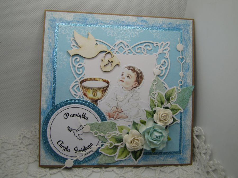 Kartka na chrzest dla chłopca w delikatnych błękitach. Wykonana na bazie ekocraftowej z najwyższej jakości papierów i dodatków. Wymiary kartki 14,5x14,5cm. Wewnątrz pusta, ale na prośbę kupującego mogę wydrukować i wkleić życzenia - do uzgodnienia. Do kartki dołączone jest pasujące ozdobne pudełko.