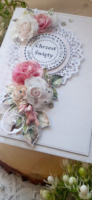 Kartka okolicznościowa do pudełka ma Chrzest Święty dla dziewczynki. Kartka jest bogato zdobiona kwiatami i innymi dodatkami. W środku kartka na życzenia podklejona taśmą dwustronną. Wymiary kartki 18x13 cm. W zestawie z pudełkiem o wymiarach 18,5x13,7x2,5 cm.