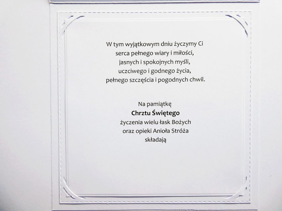 Dzięki personalizacji - imie dziecka i data Chrztu - kartka nabiera osobistego charakteru.