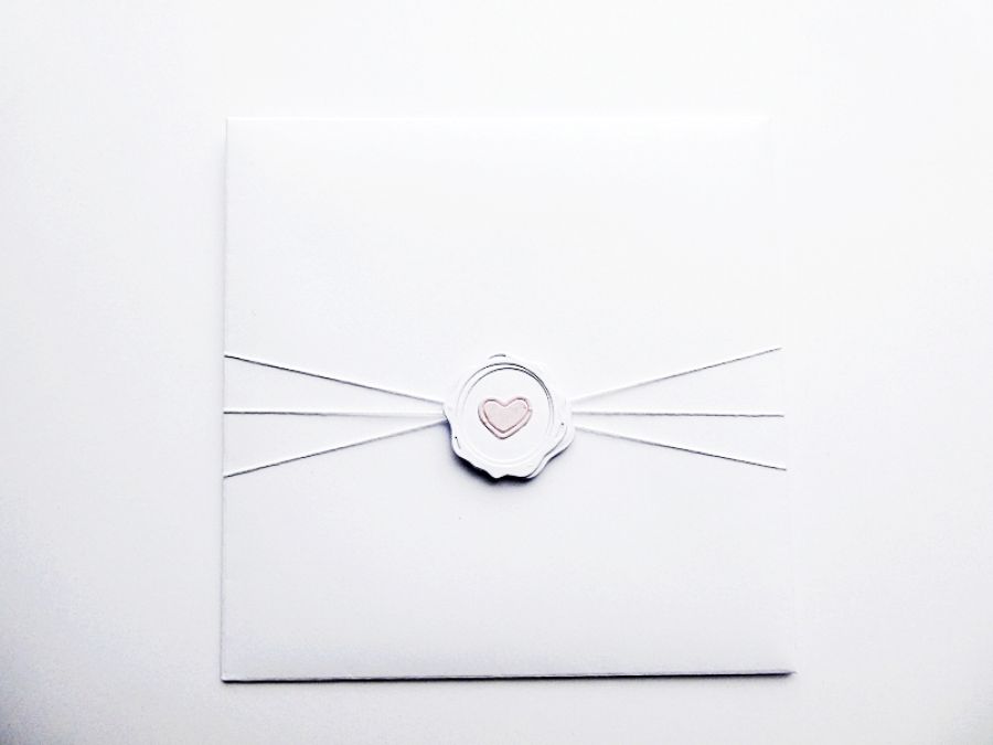 W komplecie jest elegancka biała koperta o podwyższonej gramaturze - została ona przyozdobiona dekoracyjnym sznurkiem i papierową pieczęcią z serduszkiem.