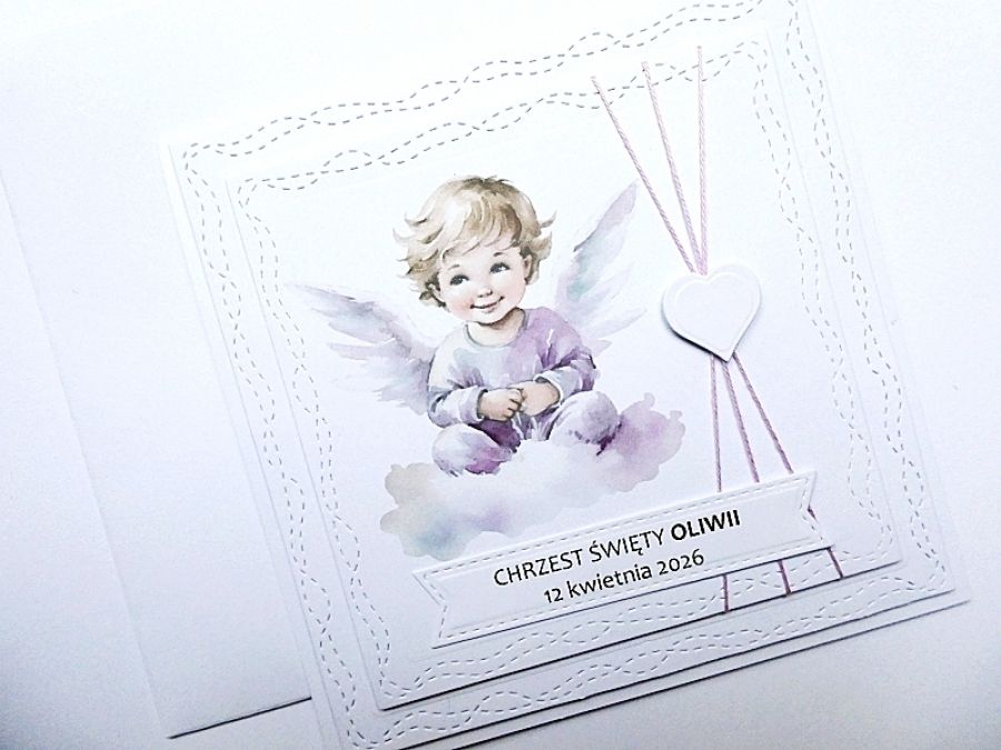 Z uroczym aniołkiem, ozdobnym sznurkiem i małym serduszkiem, które dodaje pamiątce ciepła.