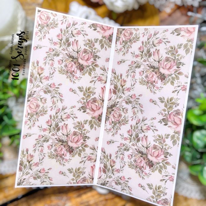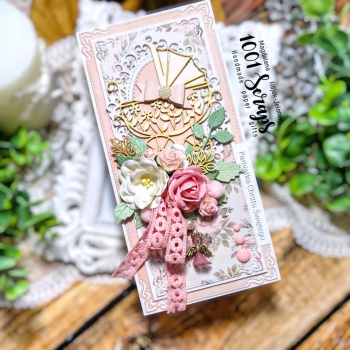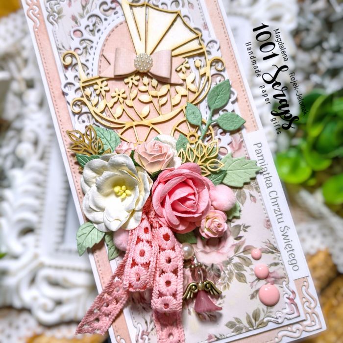 Piękna i delikatna kartka na Chrzest Św. dla dziewczynki. Kartka podłużna wykonana na białej bazie ozdobiona papierami do scrapbookingu najwyższej jakości. Na froncie kartki wózeczek z beermaty oraz bogata kompozycja kwiatowa w delikatnych odcieniach różu. W środku miejsce do wklejenia życzeń. Środek kartki również oklejony papierami do scrapbookingu, co stanowi piękne tło dla życzeń. W zależności od preferencji, w środku mogą zostać wklejone wydrukowane życzenia przesłane od Klienta lub biały karnet do własnoręcznego wypisania życzeń. Kartka pakowana do pudełeczka.