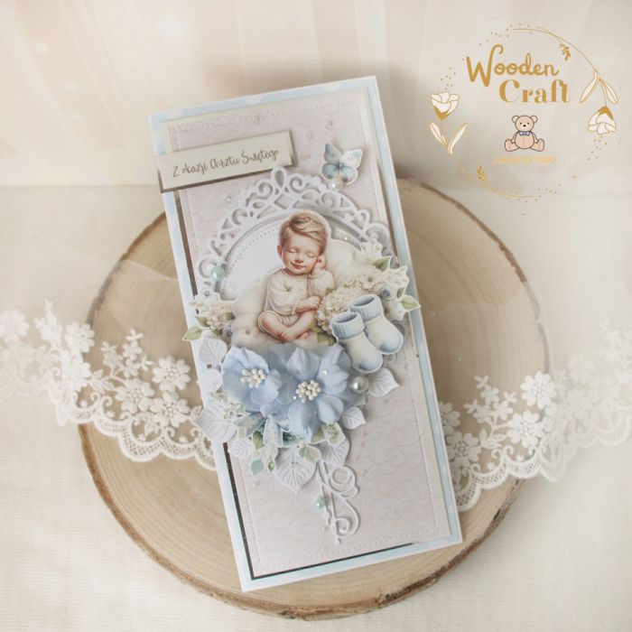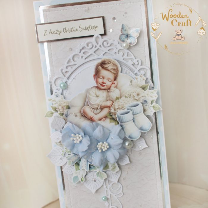 Przepiękna i delikatna, dziecięca kartka na chrzest święty, wykonana z cudownej kolekcji papierów "Cotton Candy", utrzymana w odcieniach błękitu, beżu i bieli z dodatkiem błyszczących, srebrnych akcentów. Kartka wykonana ręcznie z dbałością o każdy szczegół. Na środku znajduje się grafika uroczego, śpiącego chłopczyka, ozdobiona kompozycją kwiatową z ręcznie robioną, materiałową różyczką, dodatkowo zdobiona perełkami, iskrzącymi drobinkami, a także napisem "Z okazji Chrztu Świętego" (na życzenie mogę dodać również imię dziecka, lub całkowicie zmienić napis na inny).