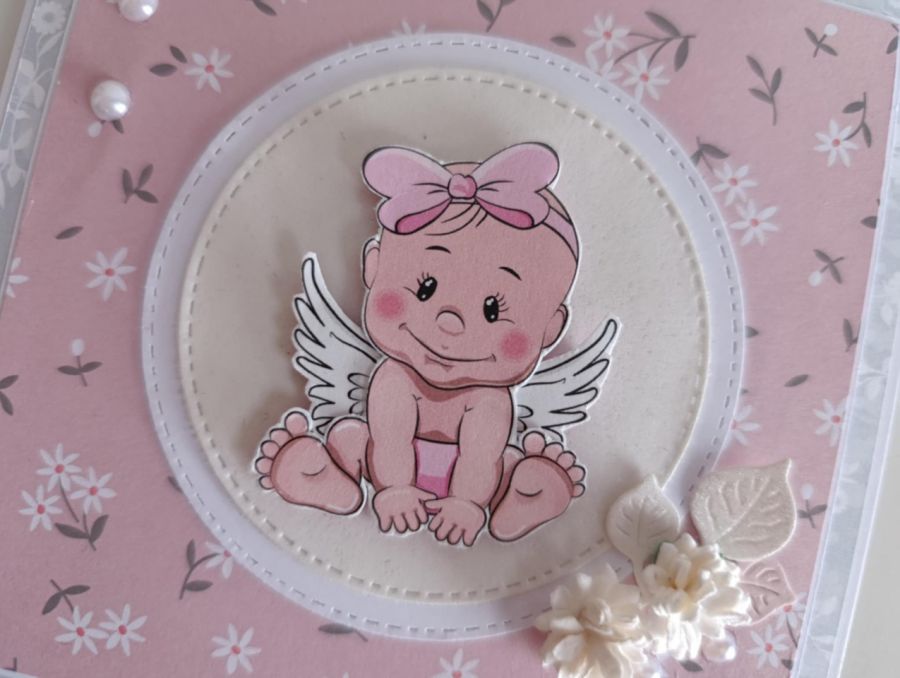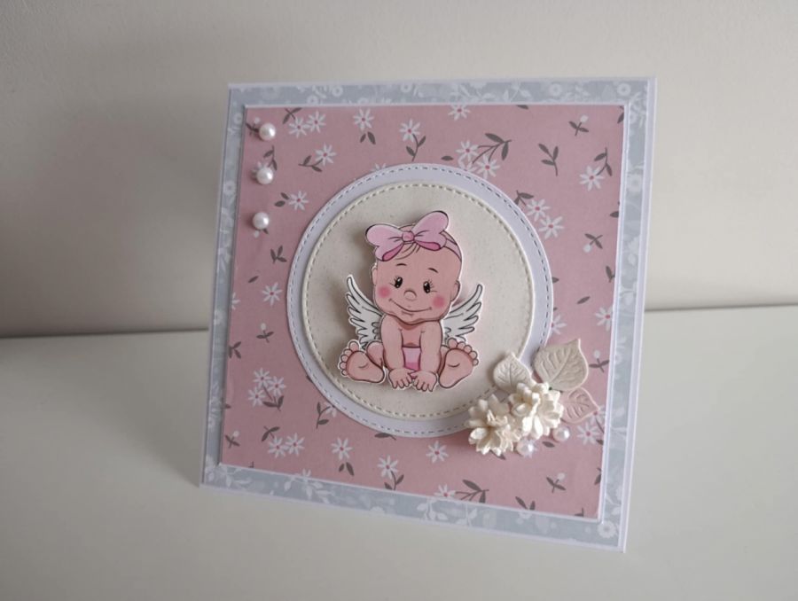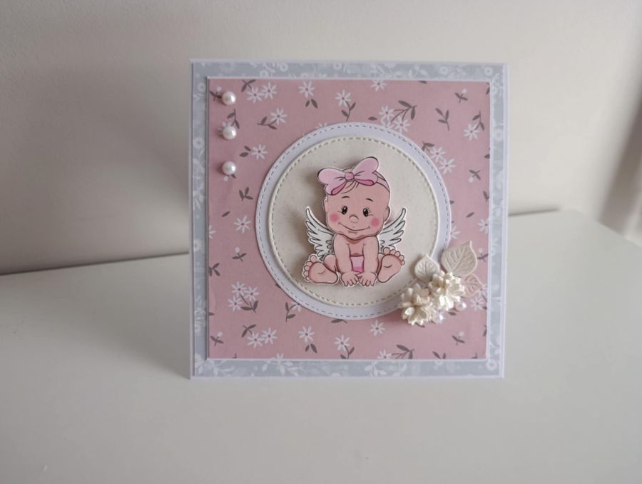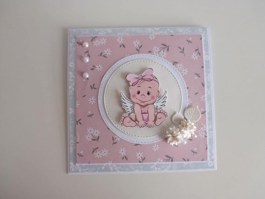 Zadaj pytanie dotyczące produktu: Kartka na Chrzest Święty z aniołkiem dla dziewczynki