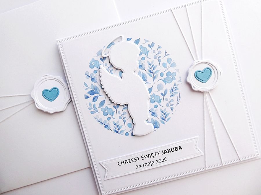 Niezwykle subtelna i delikatna - z oryginalną grafiką w niebieskim kolorze, wyciętą z papieru postacią aniołka-chłopczyka i dekoracyjnym sznurkiem ozdobionym papierową pieczęcią z sercem.