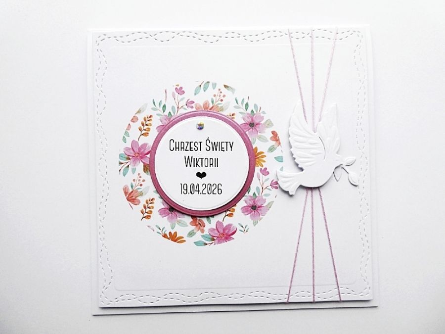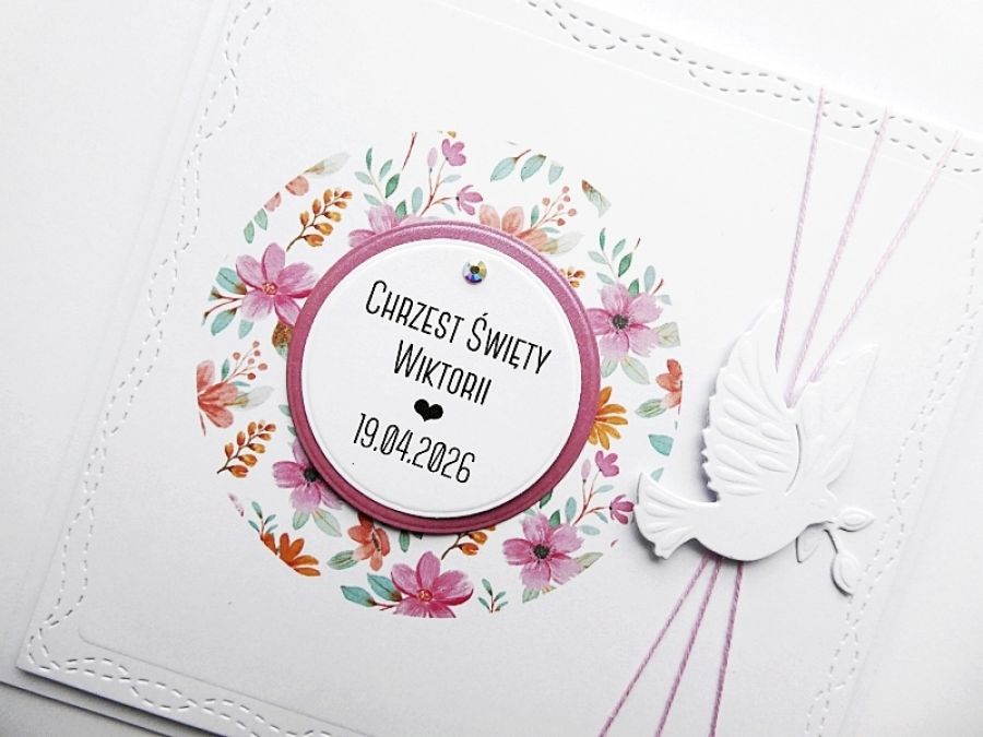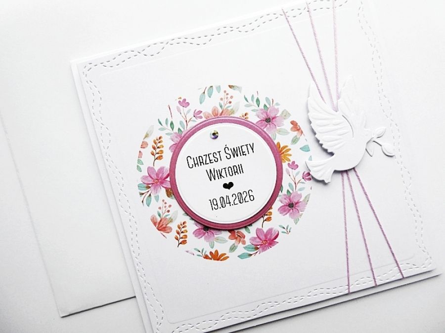 Zdobi ją piękna grafika z motywem kwiatów, dekoracyjny różowy sznurek i biała gołębica, która nawiązuje do religijnego wymiaru uroczystości.