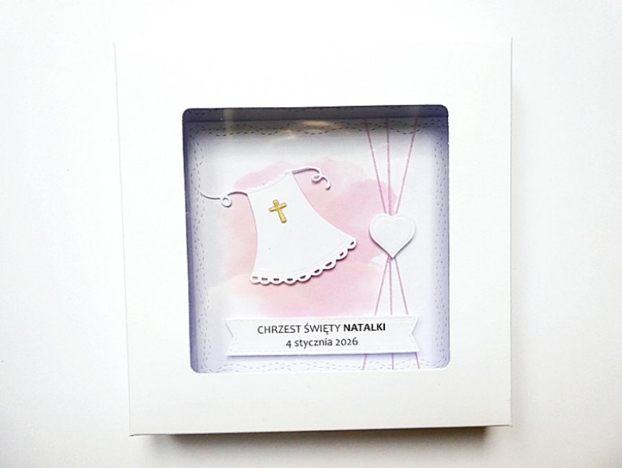 Ozdobiona dekoracyjnym sznurkiem, małym serduszkiem i wyciętą z papieru szatką, która podkreśla duchowy wymiar uroczystości.