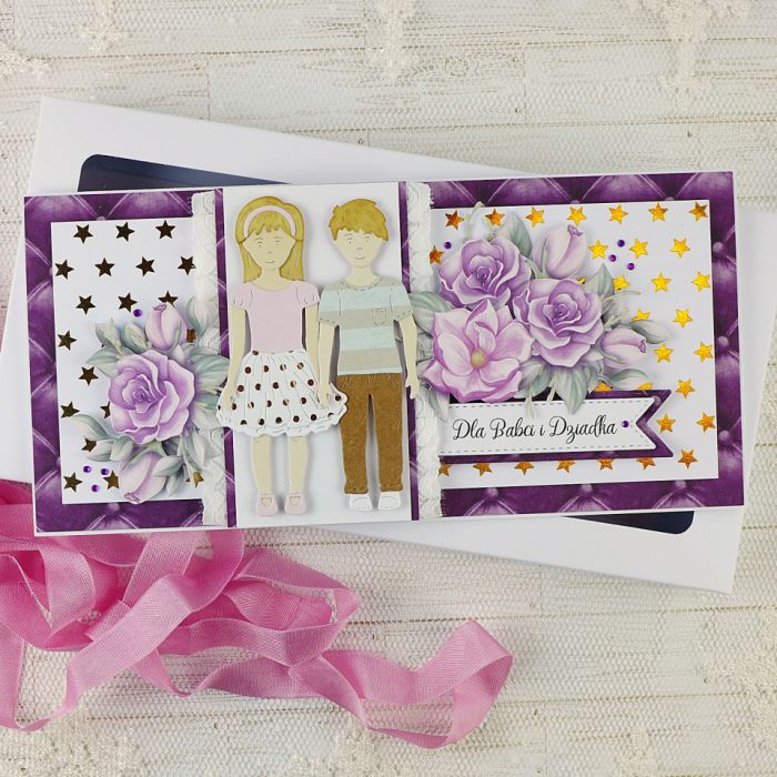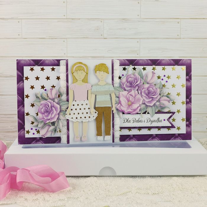 Kartka z okazji Dnia Babci i Dziadka z uroczymi postaciami dziewczynki i chłopca oraz z ilustracjami fioletowych kwiatów. Złote mieniące się gwiazdki w tle dodają kartce ciekawego, nietuzinkowego wyglądu. Wewnątrz znajduje się miejsce na życzenia. Do kartki, w cenie, dołączone białe pudełko z okienkiem.