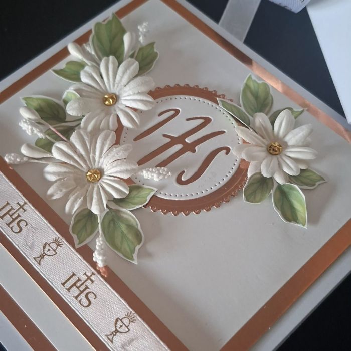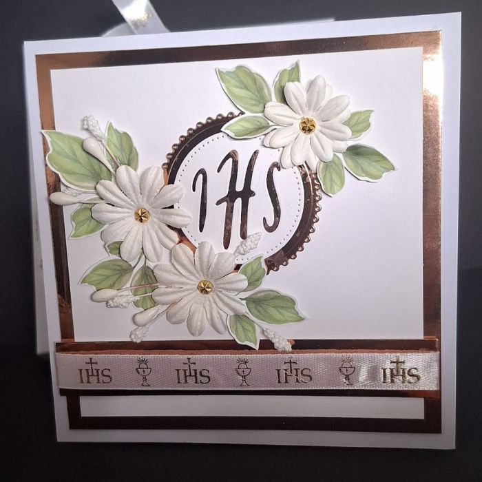 Ręcznie wykonana pamiątka I Komunii Świętej. Kartka powstała z profesjonalnych materiałów. Klasyczna, delikatna ale wyjątkowa. Kartka zamknięta w delikatnym pudełku.