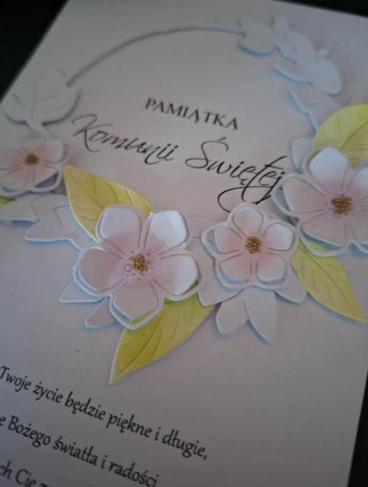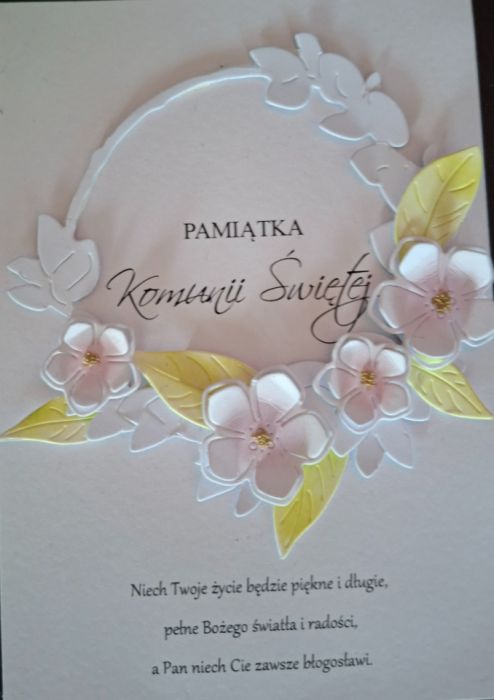 Elegancka i delikatnie zdobiona kwiatuszkami kartka z okazji I Komunii Świętej.