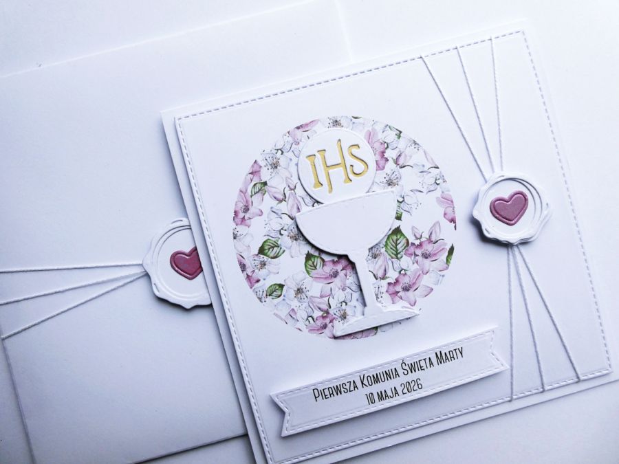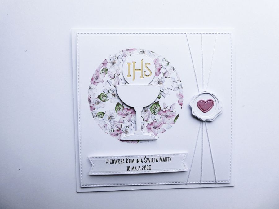 Przyozdobiona piękną kwiatową grafiką i komunijnym akcentem - kielichem z Hostią, a także cienkim białym sznureczkiem z papierowa pieczęcią i małym serduszkiem.