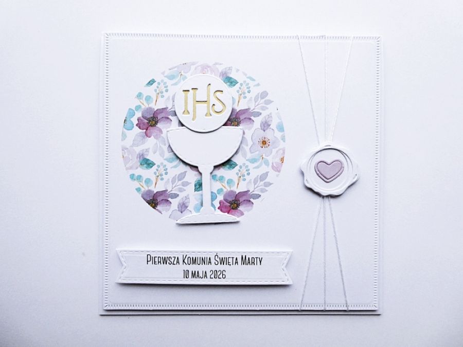 To kartka handmade, która swoją subtelnością idealnie wpisuje się w klimat Pierwszej Komunii Świętej.