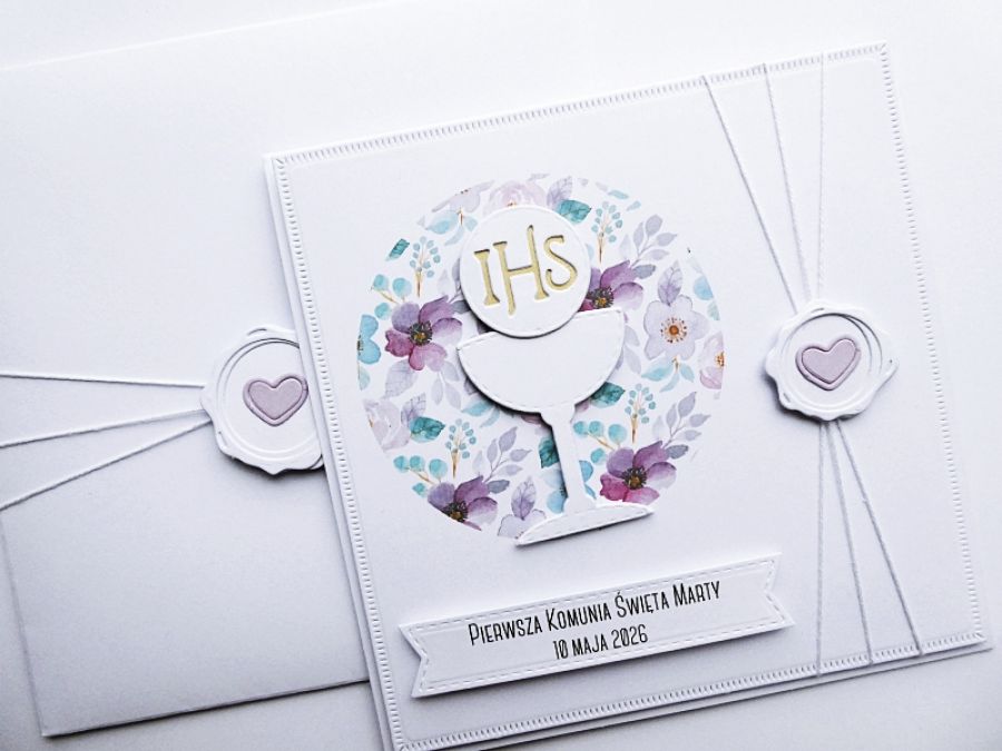 Przyozdobiona wyjątkową kwiatową grafiką w odcieniach różu i jasnego fioletu oraz komunijnymi akcentami - kielichem i Hostią.