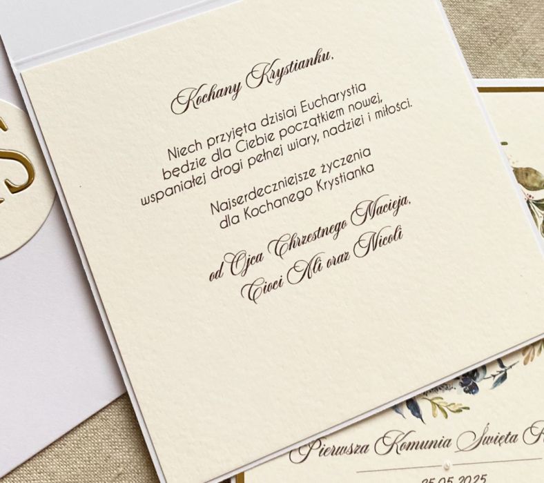 Elegancka, ręcznie wykonana, personalizowana pamiątka Pierwszej Komunii Świętej z białą, ozdobną kopertą.