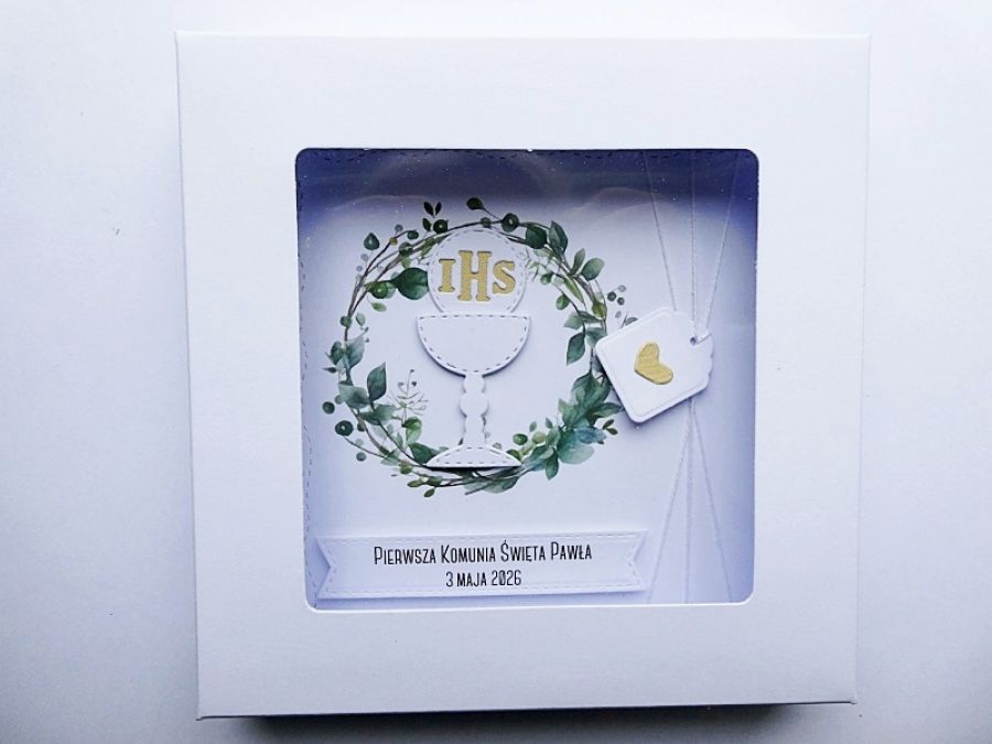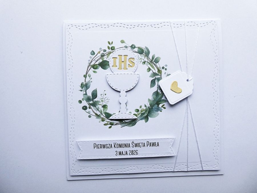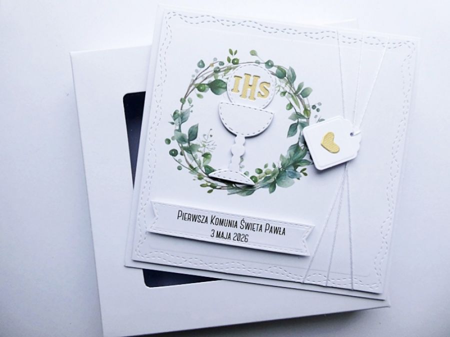 Skromna i subtelna - z wyjątkową grafiką z motywem wianka i komunijnymi akcentami - kielichem i Hostią.