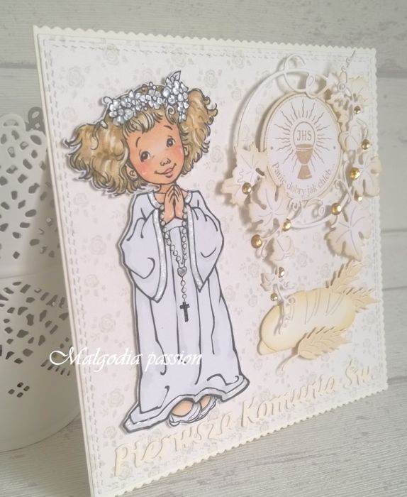 Urocza, ręcznie robiona kartka z wysokiej jakości materiałów papierniczych ozdobiona ślicznym stemplem dziewczynki kolorowanym przeze mnie oraz Hostyjką. Wewnątrz ozdobione miejsce na wpis życzeń. Do kartki dołączona koperta. Wymiary kartki ok. 14 na 14 cm. Kartka z elementami 3D wykonana z największą starannością z dbałością o szczegóły. Kolorystyka biało-kremowa. Niepowtarzalna pamiątka z okazji Pierwszej Komunii Św. Serdecznie polecam .