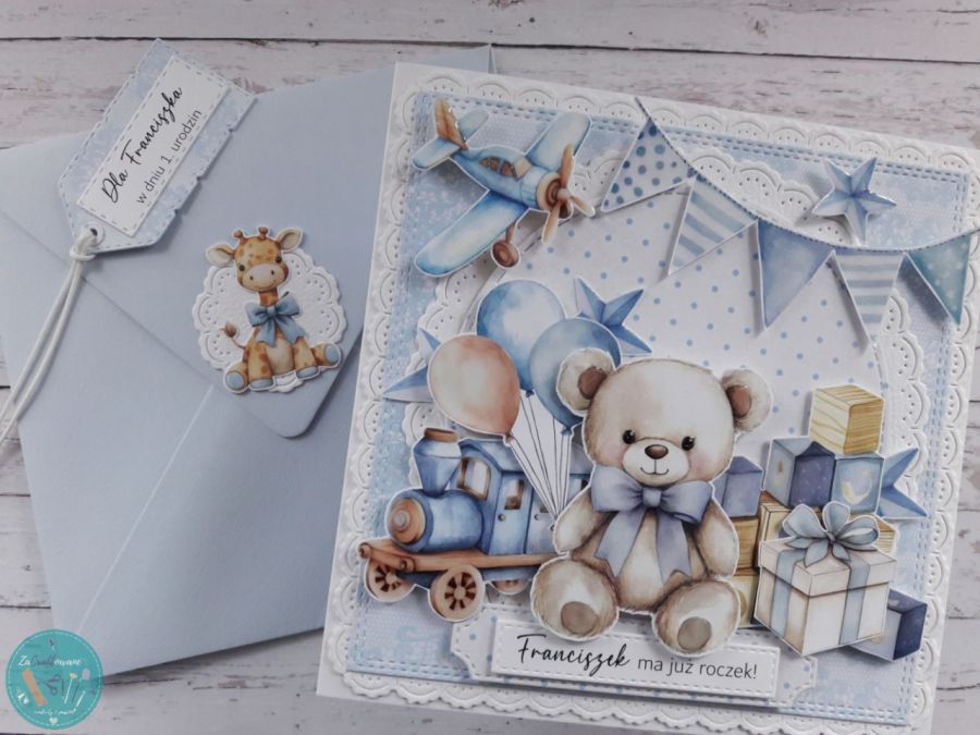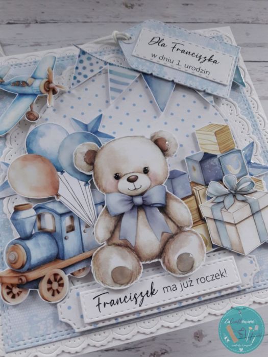 Motywem przewodnim kartki jest pokój dziecięcy wypełniony zabawkami, w tym trzymającym balony uroczym misiem, który tylko czeka na świętowanie 1. urodzin razem z Maluszkiem.