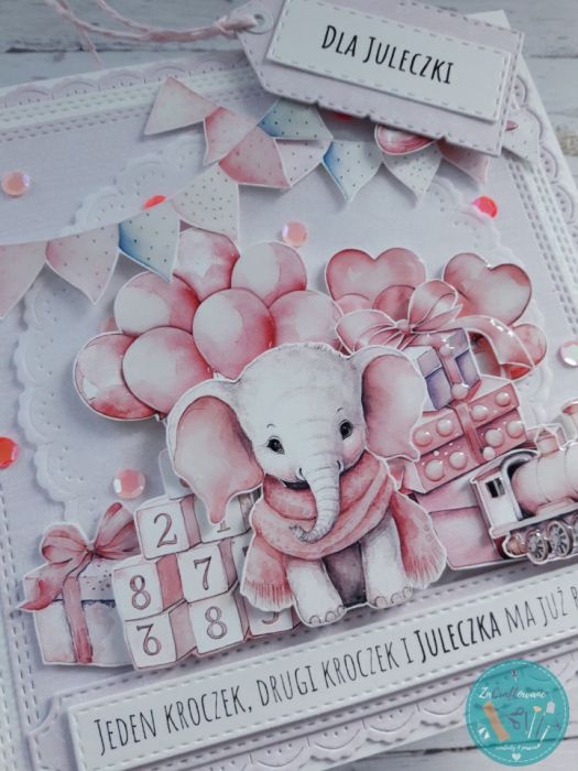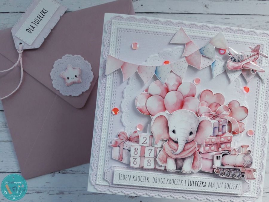 Zadaj pytanie dotyczące produktu: Kartka na roczek dla dziewczynki ze słonikiem, personalizacja