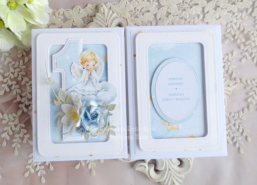 Warstwowa kartka z okazji Chrztu oraz 1. Urodzin ozdobiona ślicznymi papierami scrapowymi polskich producentów, grafiką aniołka, kwiatami oraz innymi dodatkami.