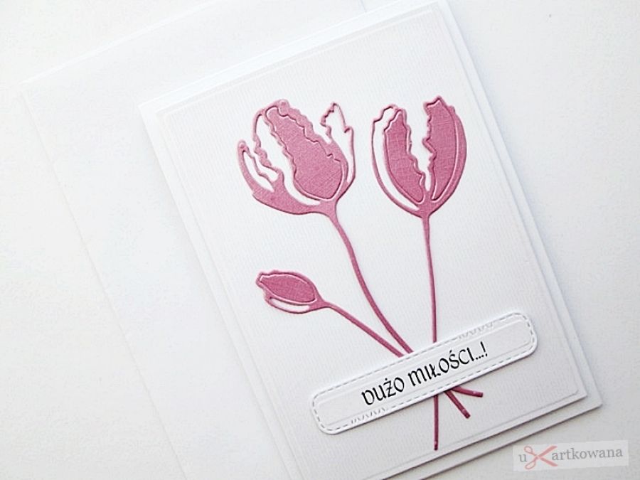 Zdobi ją bukiet dużych różowych tulipanów oraz prosty banerek z napisem DUŻO MIŁOŚCI...!