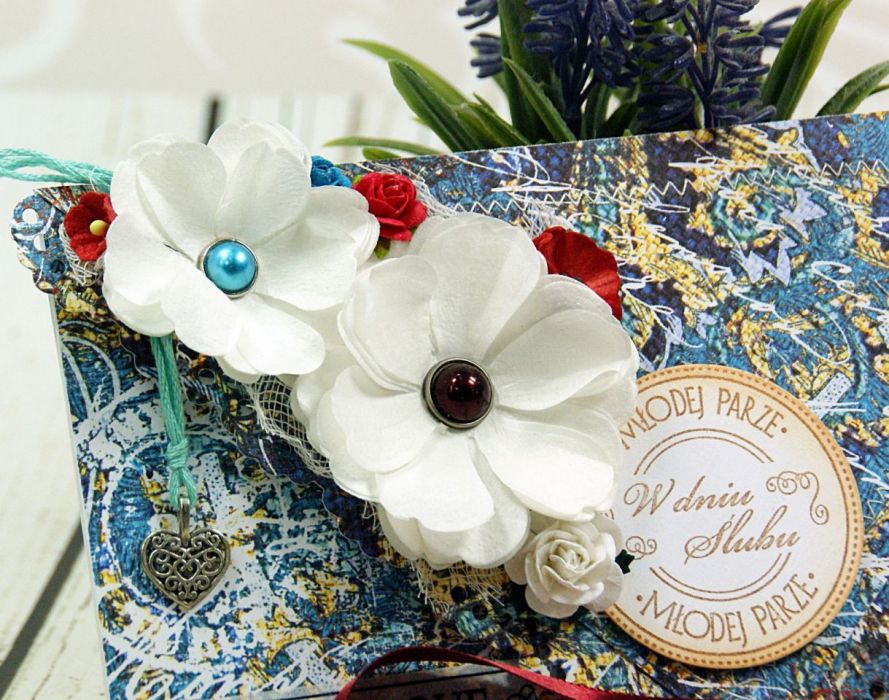 Elegancka kartka kopertówka wykonana z wysokiej jakości papierów do scrapbookingu, obszywana maszynowo. Kartka zdobiona papierowymi kwiatami oraz metalową zawieszką sercem . W środku wkładka na życzenia z cytatem .