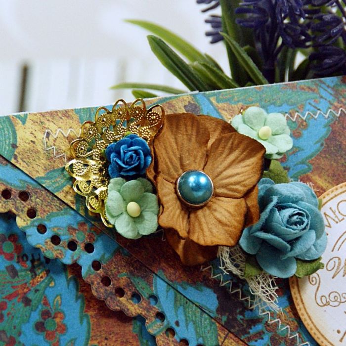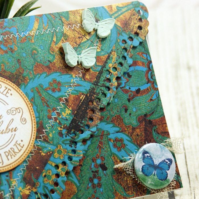 Elegancka kartka kopertówka wykonana z wysokiej jakości papierów do scrapbookingu, obszywana maszynowo. Kartka zdobiona papierowymi kwiatami oraz motylami . W środku wkładka na życzenia z cytatem .