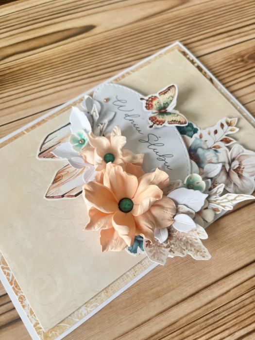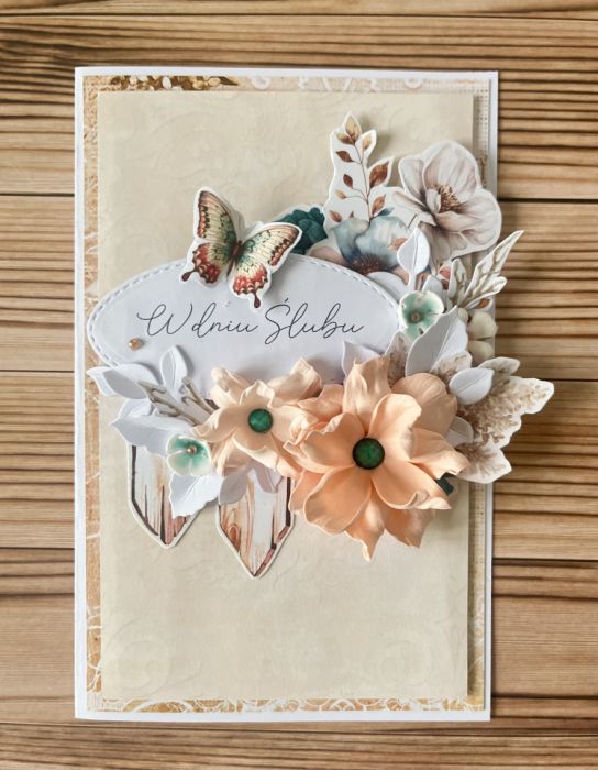 Ręcznie wykonana kartka na ślub. Ozdobiona brzoskwiniowymi kwiatami z foamiranu i wycinanymi elementami. Idealnie prezentuje się w białym pudełeczku z okienkiem.
