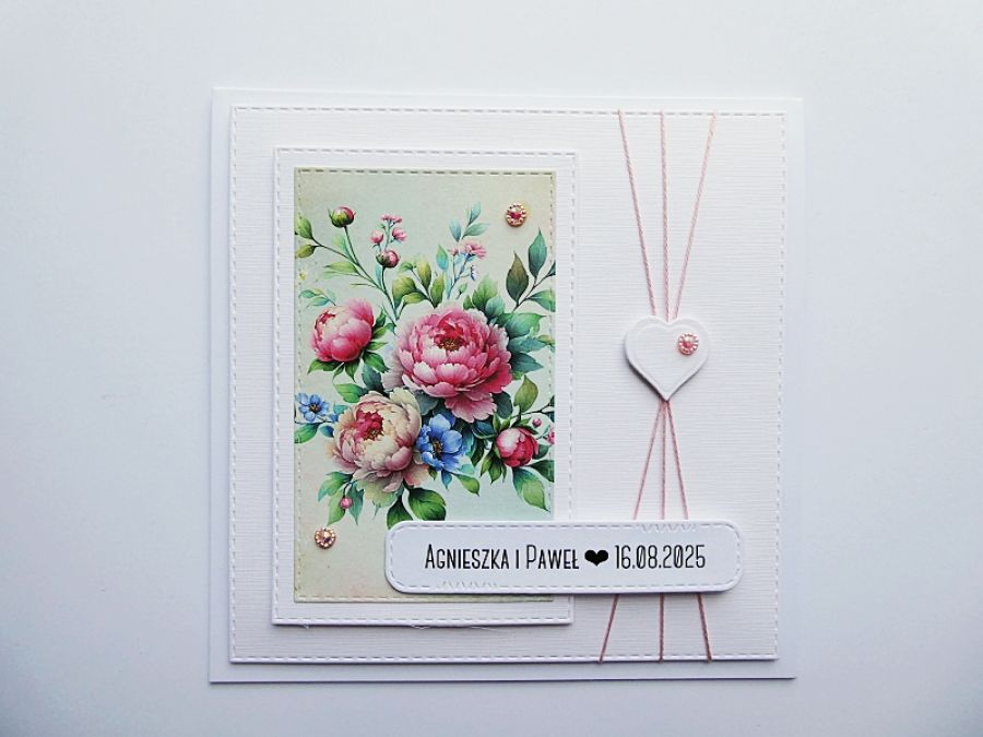 Na froncie kartki znajduje się urokliwa grafika z bukietem róż, a także różowy sznureczek, delikatne papierowe serce i subtelne, połyskujące oczka.