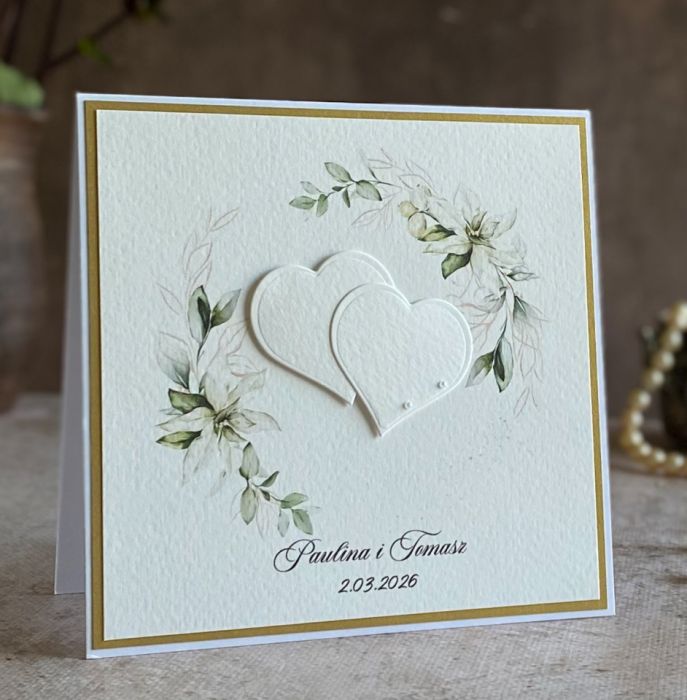 Elegancka, ręcznie wykonana kartka z okazji ślubu w ozdobnej kopercie.