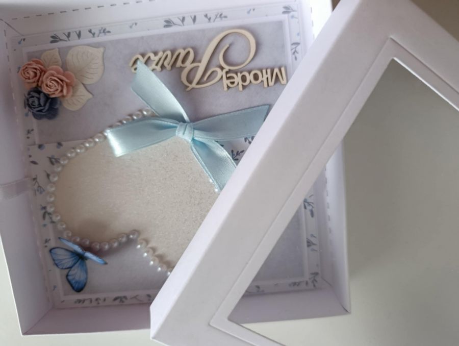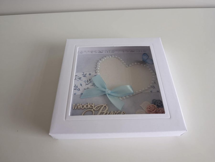 Kartka na ślub wraz z białym pudeleczkiem z okienkiem.