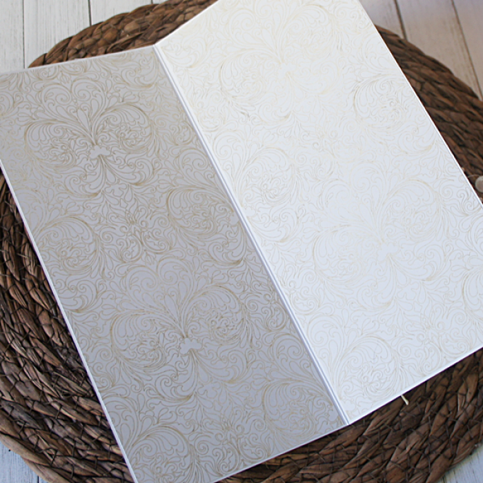 Delikatna, elegancka kartka w pudełku w jasnej kremowej kolorystyce.