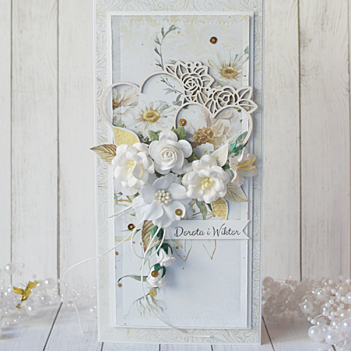 Ozdobiona licznymi wycinankami, przestrzennymi kwiatami, lnianym sznurkiem, rameczką z tektury oraz drobnymi złotymi cekinami.