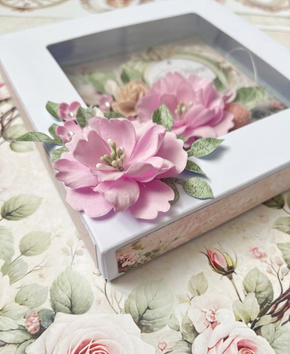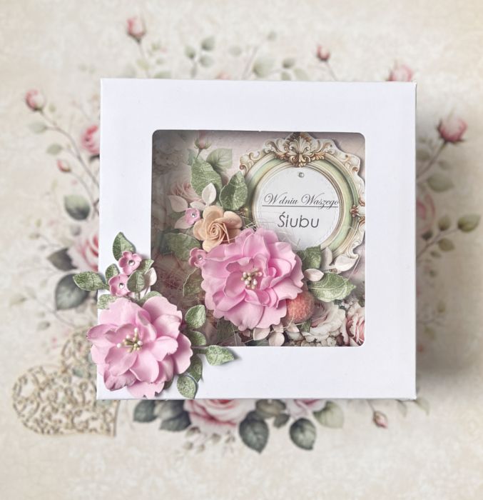 Ręcznie wykonana kartka na ślub. Ozdobiona różowymi kwiatami z foamiranu i wycinanymi elementami. Idealnie prezentuje się w ozdobionym białym pudełeczku z okienkiem.