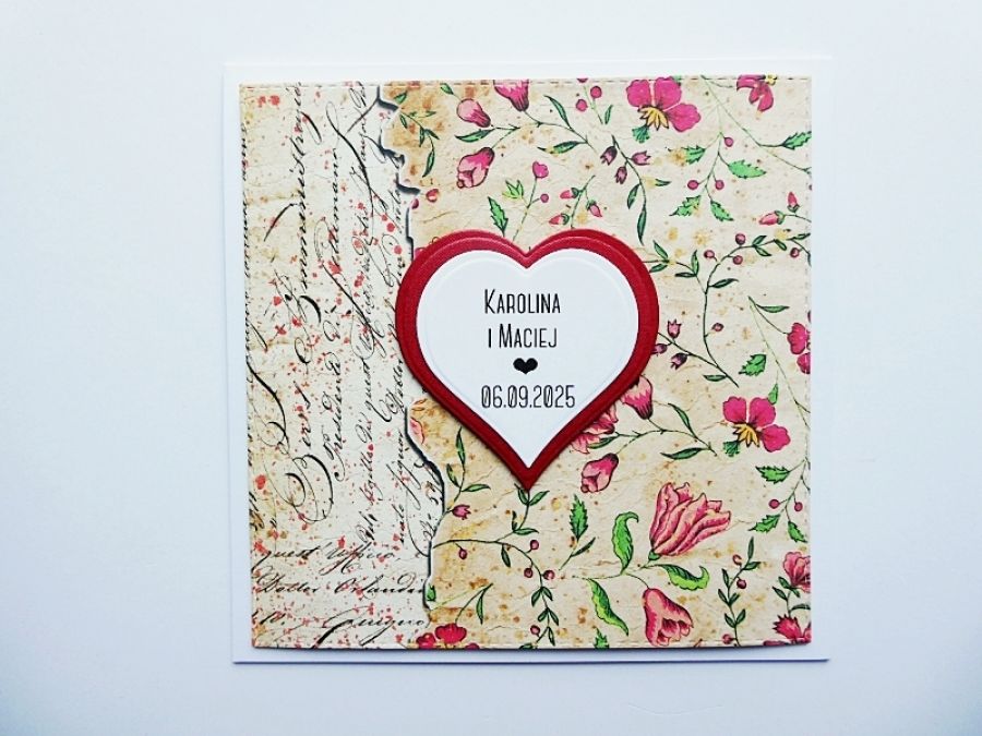 Przód zdobi banerek w kształcie serca z imionami nowożeńców i datą ich ślubu – taki detal sprawia, że kartka jest wyjątkowa.