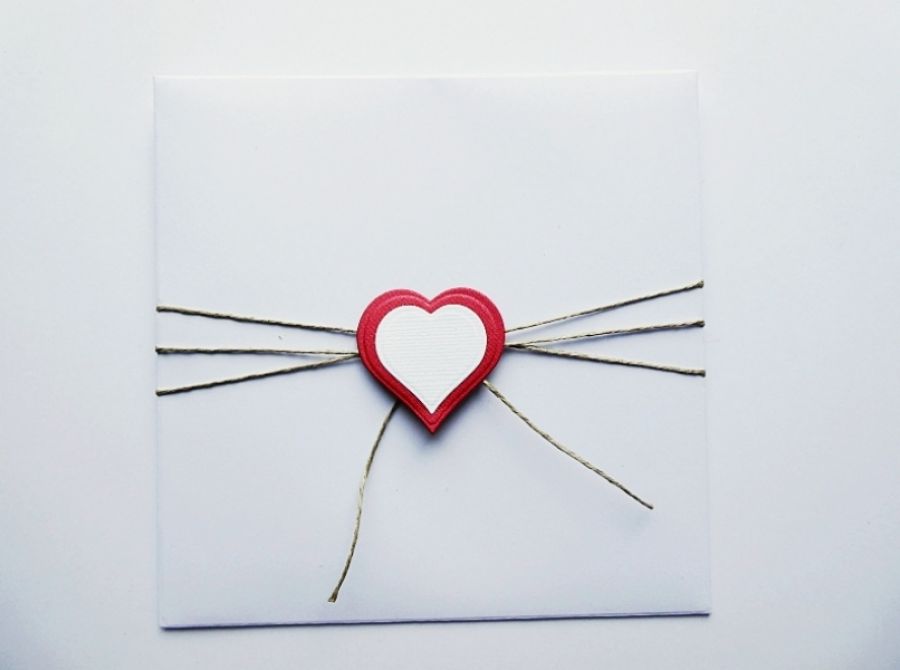 W komplecie jest biała koperta o podwyższonej gramaturze - została ona przyozdobiona nbeżowym sznurkiem i papierowym biało-czerwonym serduszkiem.
