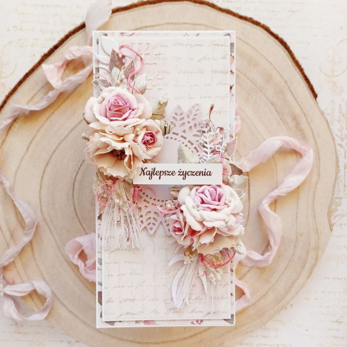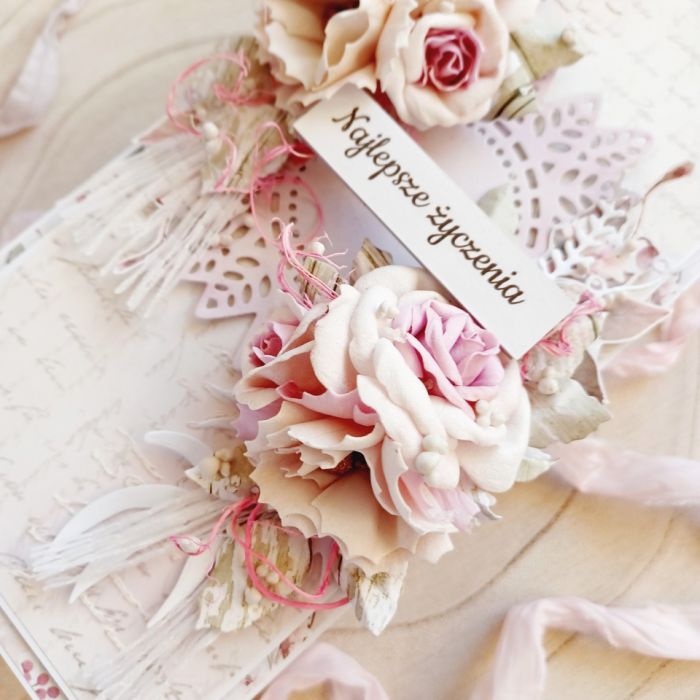 Prezentuję wyjątkowo subtelną, ręcznie robioną kartkę okolicznościową, idealną na każdą okazję: Urodziny, Imieniny, Gratulacje lub podziękowanie. Projekt w stylu vintage i shabby chic utrzymany jest w delikatnej palecie bieli, beżu oraz pudrowego różu. Centralnym elementem są przestrzenne, ręcznie formowane róże oraz ażurowe detale, które nadają kartce wyrafinowanego i ekskluzywnego charakteru. To eleganckie rękodzieło wykonane techniką scrapbooking, dostępne na Artillo.