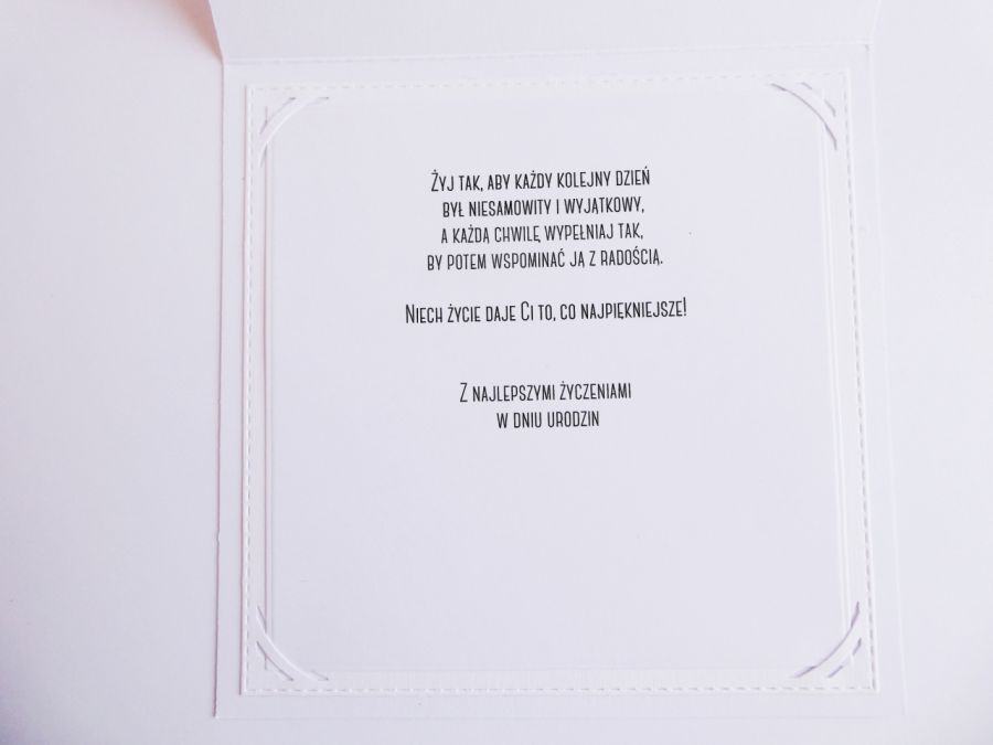 Kartka ma wklejony w środku biały karnecik, w którym umieszczona została wkładka z życzeniami.