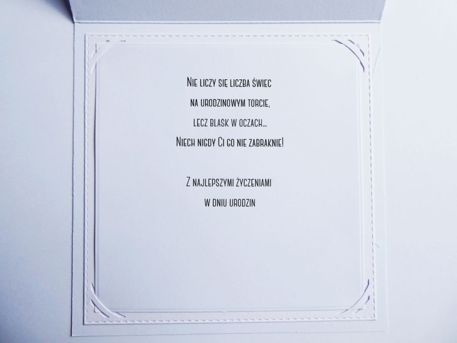 Kartka ma wklejony w środku biały karnecik, w którym umieszczona została wkładka z życzeniami.
