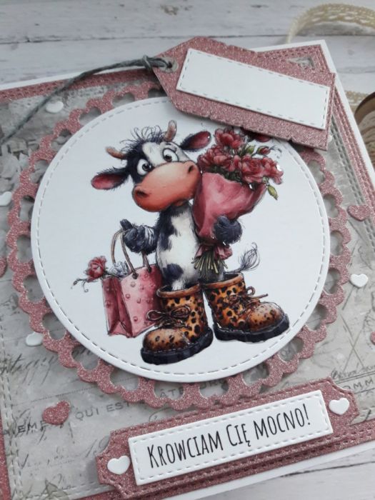 Ręcznie robiona kartka walentynkowa z uroczym byczkiem wykonana metodą scrapbookingu z wykorzystaniem profesjonalnych materiałów i z dbałością o każdy szczegół.