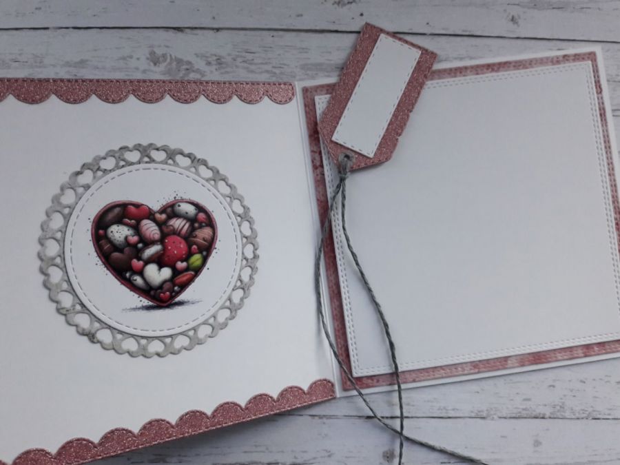 Do kartki dołączam GRATIS w postaci widocznej na zdjęciu etykietki, za pomocą której można podpisać upominek walentynkowy i przyczepić ją do wstążki, którą obwiązany jest prezent, za pomocą sznureczka, który również znajduje się w zestawie.