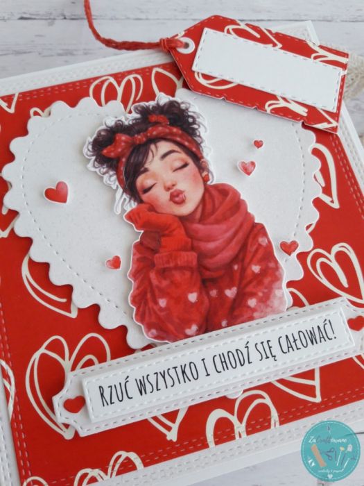 Ręcznie robiona kartka walentynkowa z całuśną dziewczyną wykonana metodą scrapbookingu z wykorzystaniem profesjonalnych materiałów i z dbałością o każdy szczegół.