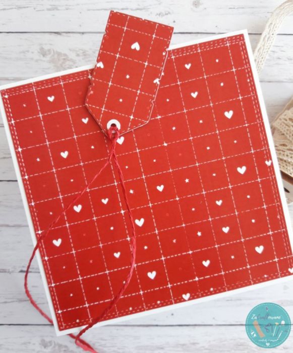 Do kartki dołączam GRATIS w postaci widocznej na zdjęciu etykietki, za pomocą której można podpisać upominek walentynkowy i przyczepić ją do wstążki, którą obwiązany jest prezent, za pomocą sznureczka, który również znajduje się w zestawie.