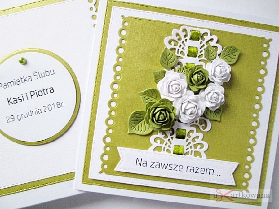 Główną ozdobę kartki stanowi bukiet ręcznie robionych - limonkowo-białych - różyczek. Zostały one umieszczone na pięknej ażurowej wycinance, którą zdobi dopasowana kolorystycznie wstążka. Skromność kartki podkreśla prosty banerek z napisem: Na zawsze razem...