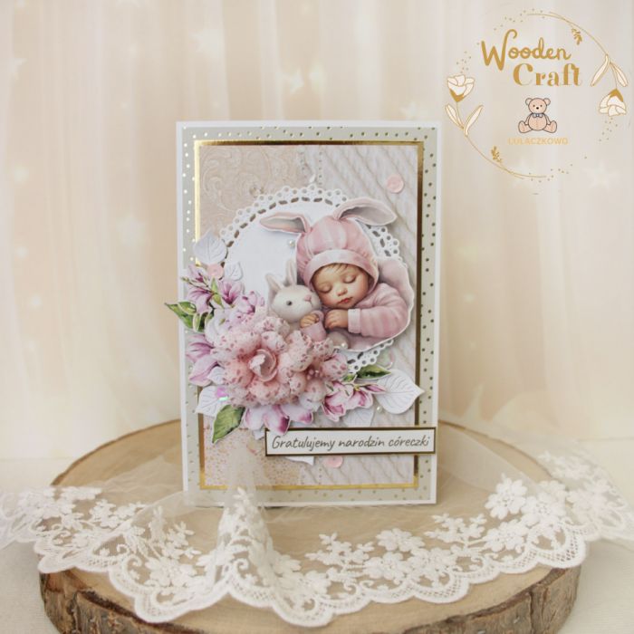 Przepiękna i delikatna kartka gratulacyjna z okazji narodzin maluszka, utrzymana w odcieniach oliwkowej zieleni, beżu i różu z dodatkiem złotych błyszczących akcentów. Kartka wykonana ręcznie z dbałością o każdy szczegół, z mixu kolekcji papierów. Na froncie znajduje się grafika uroczej śpiącej dziewczynki z króliczkiem, ozdobiona kompozycją kwiatową z materiałowych kwiatuszków, dodatkowo zdobiona cekinami, a także napisem "Gratulujemy narodzin córeczki" (na życzenie mogę wkleić na kartce również imię dziecka).
