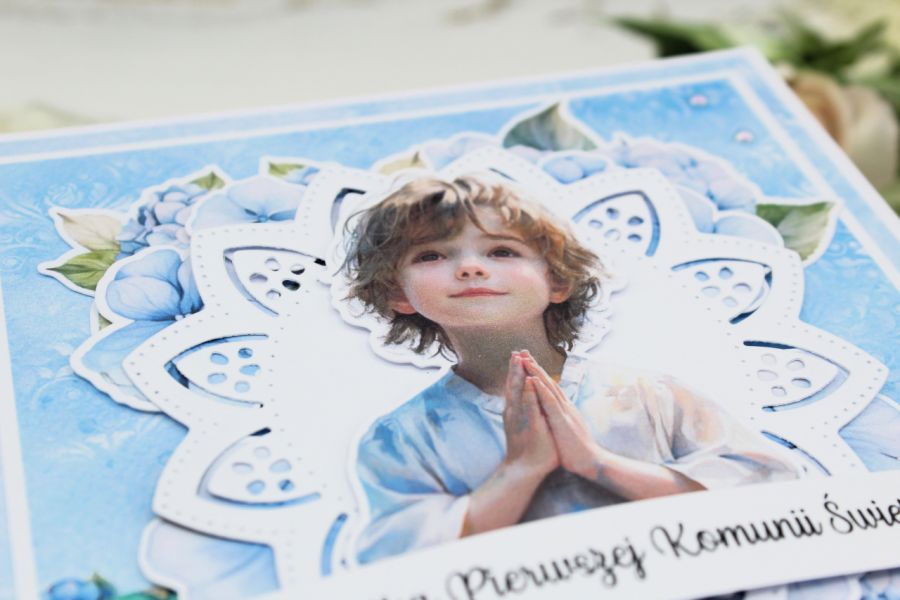 W środku tradycyjnie – możemy pozostawić puste pole, do własnoręcznego wypisania. Natomiast domyślnie, umieszczam kartkę z przepięknymi życzeniami z okazji Pierwszej Komunii Świętej. Dodatkowo, całość wykończyłam wykrojonymi elementami, ze wzoru z przodu kartki. Wszystko jest spójne i schludne. Uznałam, że tak elegancka propozycja nie potrzebuje więcej bajerów.