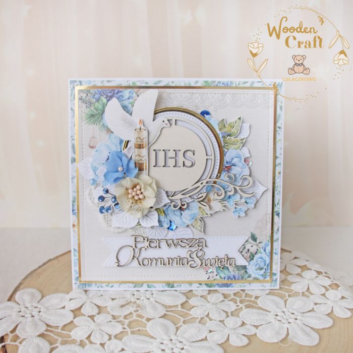Piękna, elegancka kartka komunijna, pamiątka Pierwszej Komunii Świętej, wykonana ręcznie z najwyższą starannością, z cudownej kolekcji papierów "Sapphire Days", utrzymana w pastelowych odcieniach błękitu, kremu i bieli, z dodatkiem złotych, błyszczących akcentów. Na środku kartki umieszona została tekturka przedstawiająca hostię świętą otoczoną kompozycją kwiatową, z ręcznie wykonanymi, materiałowymi kwiatami, ozdobiona grafikami świecy komunijnej i gołębicy oraz tekturkowym napisem "Pierwsza Komunia Święta"- do napisu mogę również dodać imię dziecka.